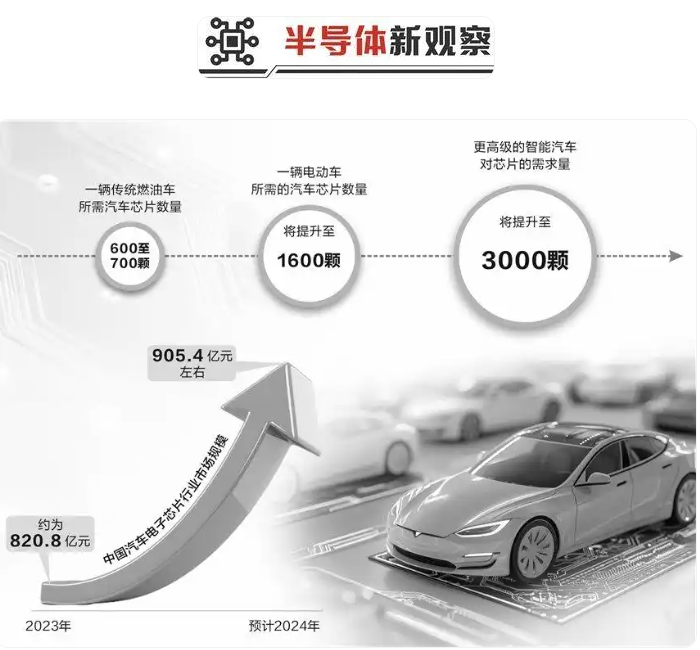 據(jù)機構預測,2023年中國汽車電子芯片行業(yè)市場規(guī)模約為820.8億元,預計2024年增至905.4億元左右。