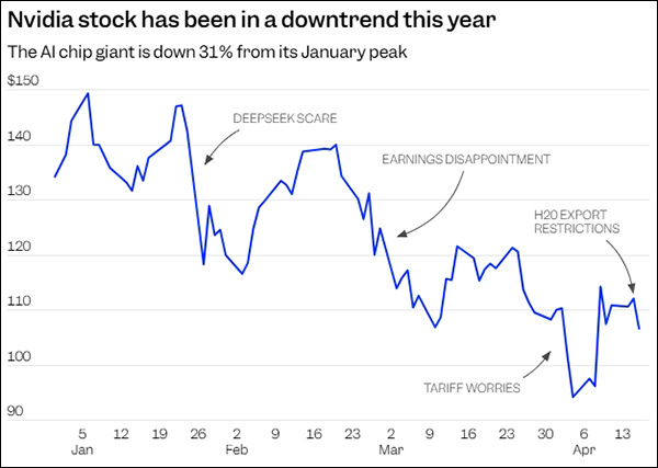 “今年,英偉達投資者都無法獲得喘息。”美國“商業內幕”網站17日分析稱,今年接二連三的事件都在打擊英偉達的股價,從DeepSeek需要更少人工智能芯片的系統、特朗普的關稅政策到最新的出口限制措施,該股今年迄今已下跌逾20%,相較于1月高點下跌約30%,跌幅遠超科技公司占大頭的納斯達克100指數。市場對英偉達股票的擔憂加劇。