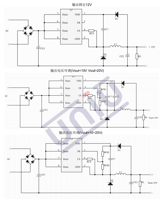 •主要特點:集成 650V 高壓啟動電路;多模式控制、無異音工作;支持降壓和升降壓拓撲;默認 12V 輸出( FB 腳懸空);待機功耗低于 50mW;良好的線性調整率和負載調整率;集成軟啟動電路;內部保護功能 :過載保護 (OLP);逐周期電流限制 (OCP);輸出過壓保護 (OVP);VDD 過壓、欠壓和電壓箝位保護