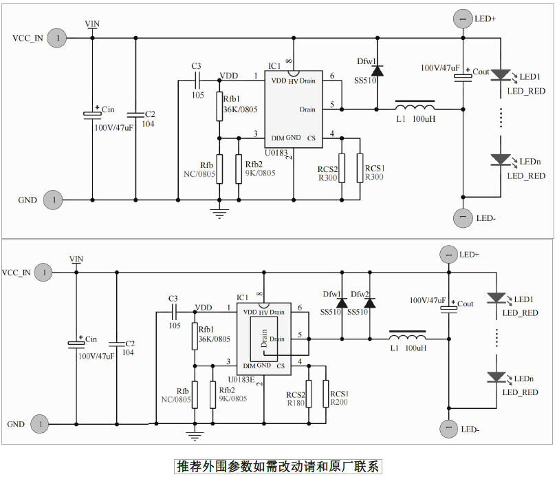 U0183(E)是一款內置100V功率MOS高效率、高精度的開關降壓型大功率LED恒流驅動芯片。U0183(E)采用固定關斷時間的峰值電流控制方式。U0183(E)通過調節外置的電流采樣電阻,能控制高亮度LED燈的驅動電流,使LED燈亮度達到預期恒定亮度。在DIM端加支持線性電壓控制調光,進行LED燈調光。U0183(E)內部采用自供電結構,VDD UVLO保護以及過溫保護電路等,減少外圍元件并提高系統可靠性。