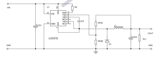 •產品描述:U3507D是一個高壓降壓開關穩壓器內置MOSFET。它集成了一個高側、高電壓、功率MOSFET,通常電流限制為10A(IPK)。輸入范圍適應各種降壓應用,使其成為汽車,工業和照明應用的理想選擇。遲滯電壓模式控制采用非??斓捻憫?。UNIU專有的反饋控制方案最大限度地減少了所需外部組件的數量。開關頻率為150KHz,允許元件尺寸小。熱停機和短路保護(SCP)提供可靠和容錯的操作。低靜態電流允許U3507D用于電池供電的應用。U3507D采用DFN5*6-10封裝,帶外露襯墊。
